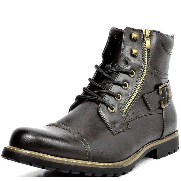 Træd ind i den dristige stilverden med vores læderstøvler, en perfekt blanding af kantet design og funktionalitet. Disse afslappede ankelstøvler har en unik dobbelt lynlås i metal, der forbedrer både æstetik og funktionalitet, hvilket gør dem ideelle til den moderne mand med en forkærlighed for motorcykelinspireret mode.