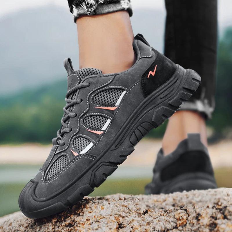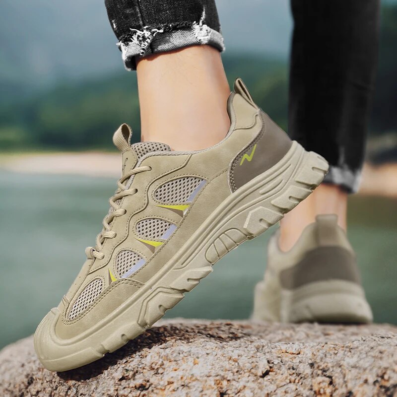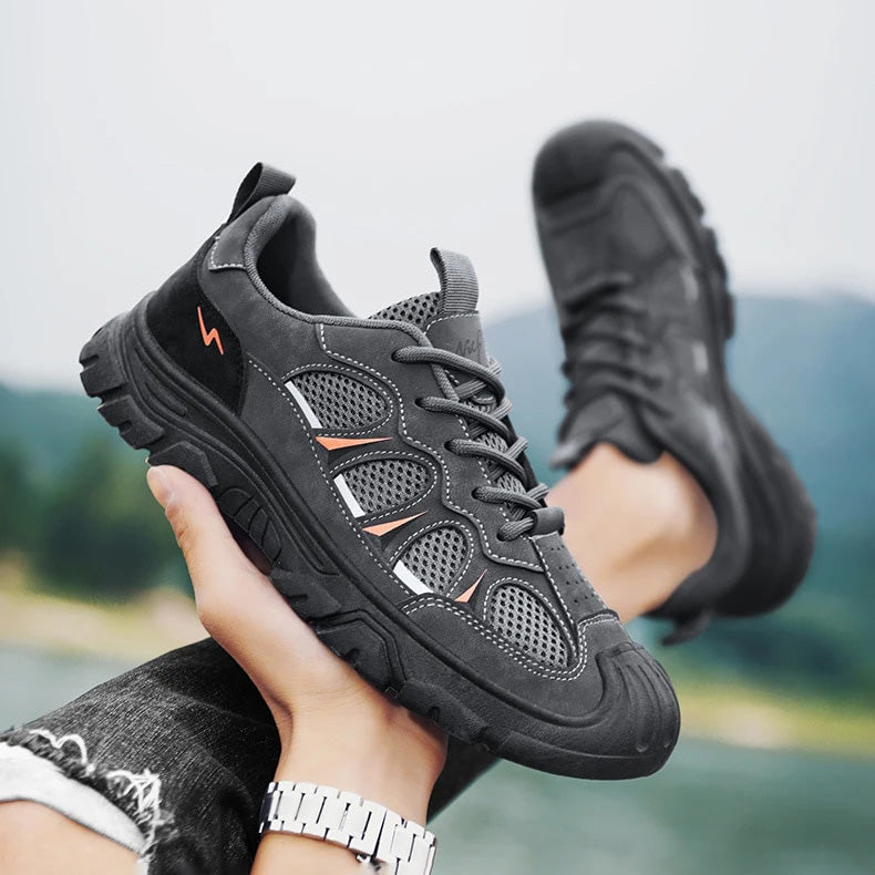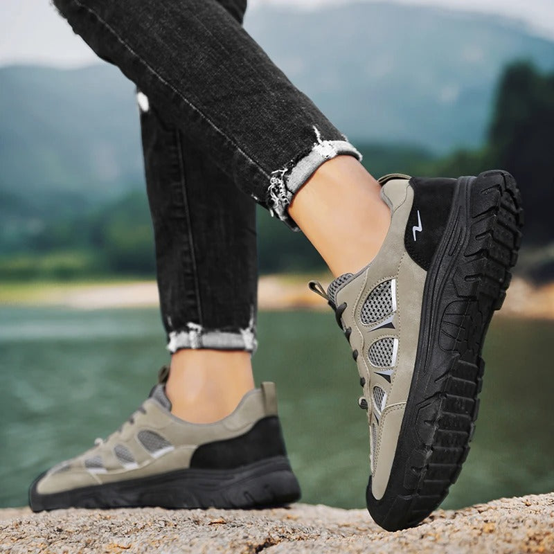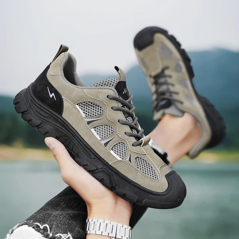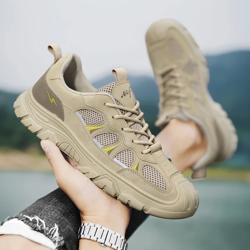 Vi præsenterer vores outdoor-sneakers, den ultimative kombination af holdbarhed, komfort og stil til den aktive mand. Fremstillet af kvalitetslæder med åndbart mesh-for, holder disse sneakers dine fødder kølige og komfortable under alle aktiviteter. Den robuste, tykke sål giver enestående støtte og greb, hvilket gør dem velegnede både til afslappede arbejdsmiljøer og udendørs eventyr.