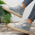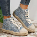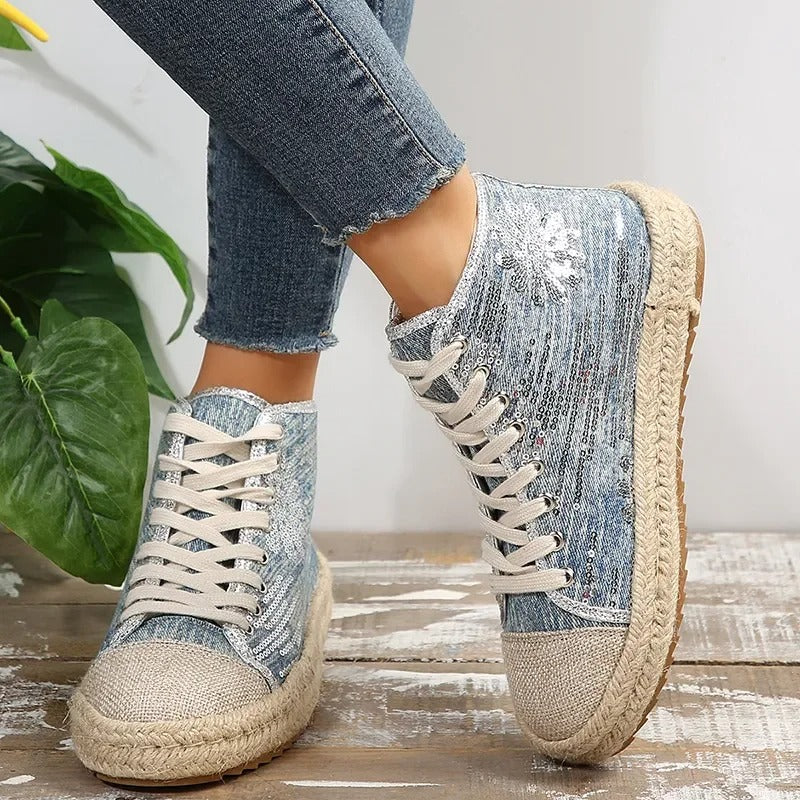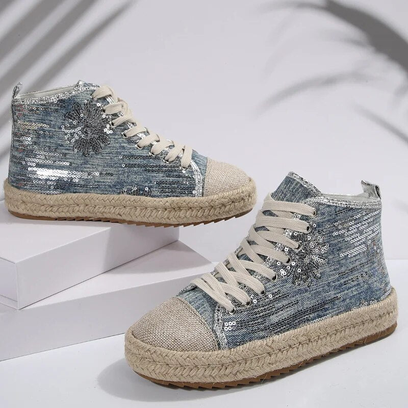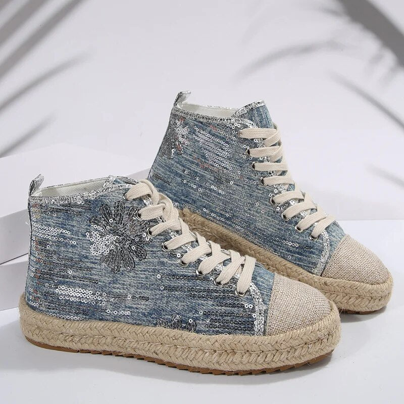 Træd ind i en verden, hvor vintage-charme møder moderne flair - med vores denim-sneakers. Disse unikke sneakers kombinerer den klassiske charme fra denim med det iøjnefaldende glimt af palietter og skaber et moderigtigt look, der skiller sig ud. Snørebåndene sikrer en sikker og justerbar pasform, mens den flade sål giver komfort og stabilitet hele dagen.