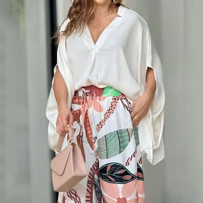 Blusen er lavet af materiale af høj kvalitet og har en flatterende pasform, der ubesværet kan styles til både formelle og uformelle lejligheder. De luftige bukser er perfekte til varme dage og tilbyder ultimativ komfort takket være det løse snit og det åndbare stof.
