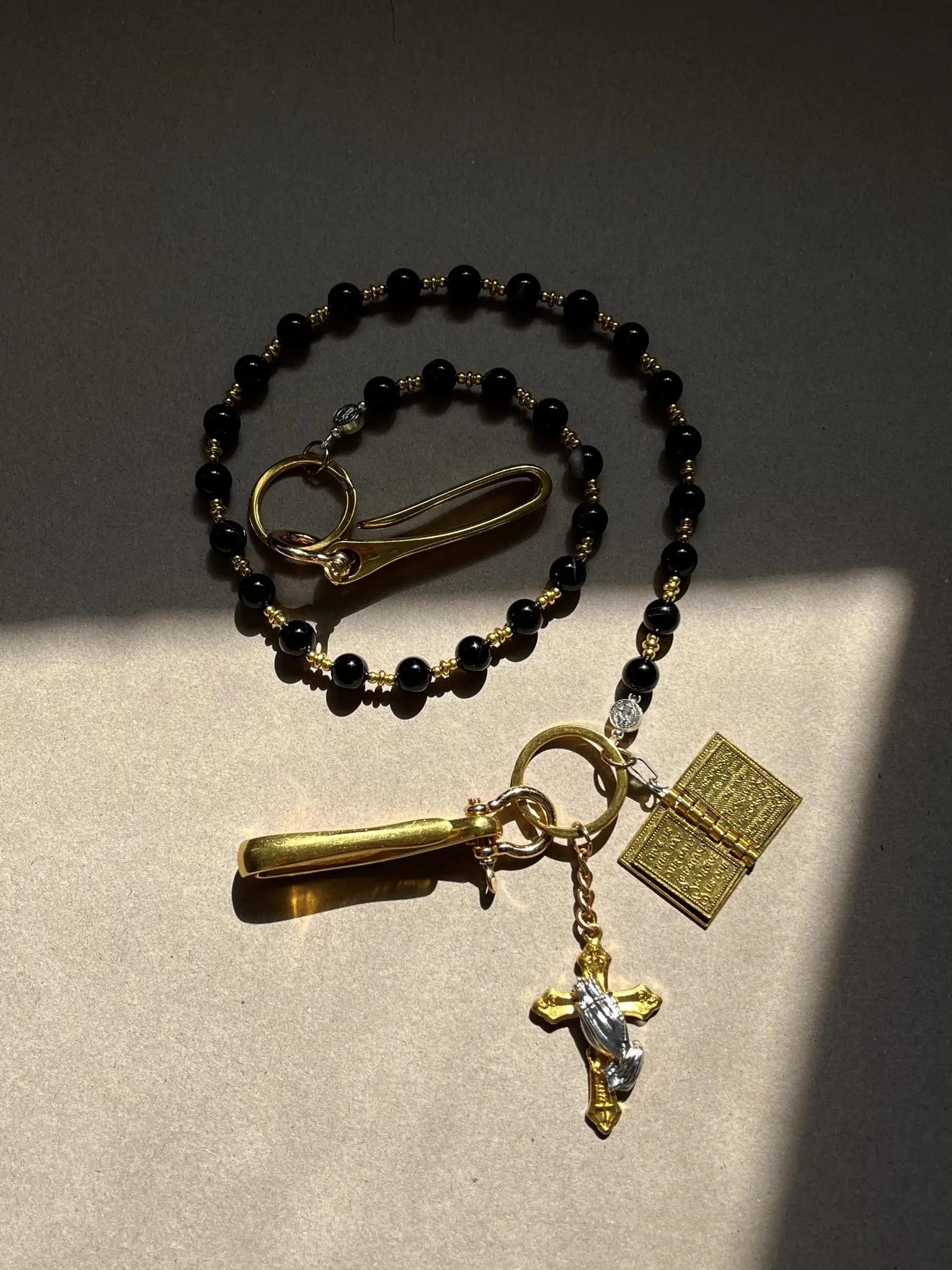 Diese einzigartige Kombination aus robusten Gliedern, edlen schwarzen Perlen und einem markanten Kreuzdetail verbindet Stärke mit raffinierter Eleganz.