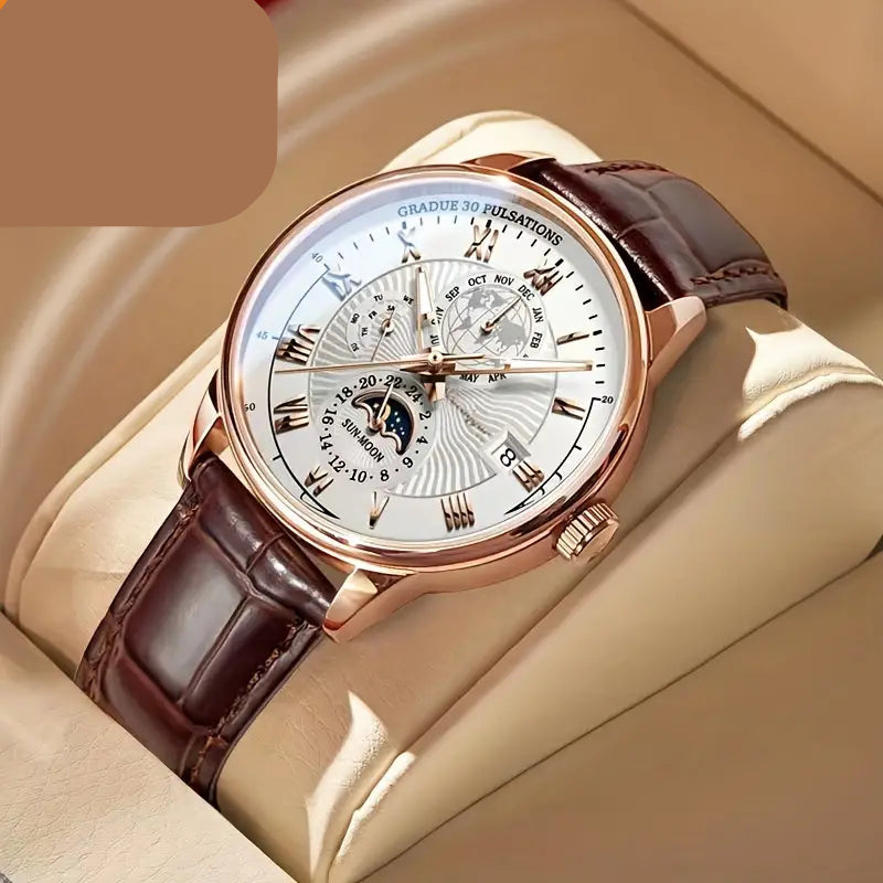 Mit ihrem Automatikwerk, Saphirglas und edler Mondphasen-Komplikation ist sie mehr als nur ein Zeitmesser – sie ist ein stilvolles Statement.