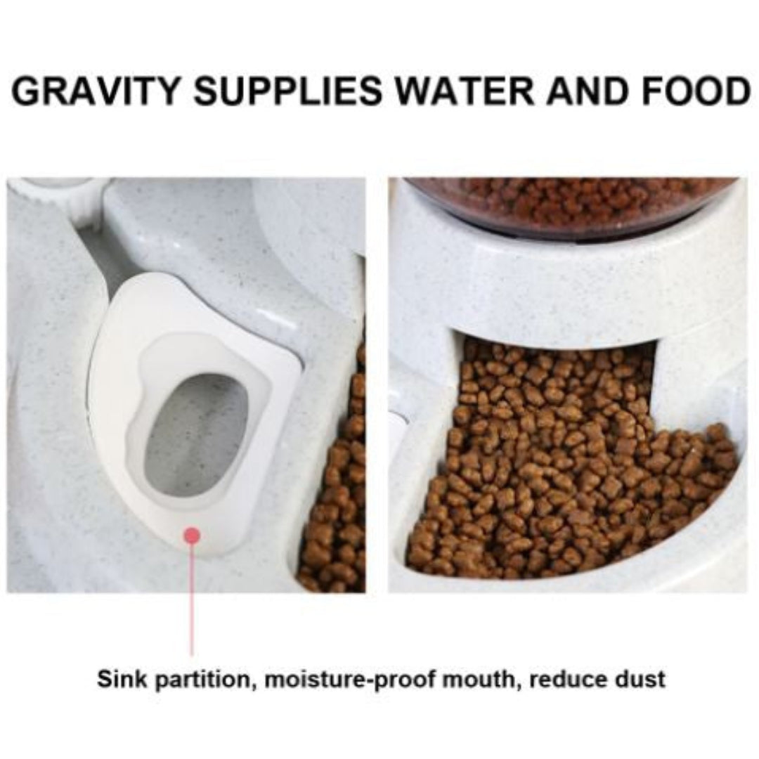 Dieser clevere und praktische Futterspender kombiniert einen Futternapf und einen Wasserspender in einem kompakten Design und ist somit perfekt für Hunde und Katzen geeignet.