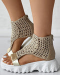 Heben Sie Ihren Sommerstil mit Giselas Geflochtenen Geometrie-Sandalen auf ein neues Level. Diese Sandalen sind mit aufwendigen Flechtdetails und einem stilvollen geometrischen Design gefertigt und bieten die perfekte Mischung aus Mode und Komfort. Der Keilabsatz sorgt für eine schmeichelhafte Erhöhung, während das gestrickte elastische Obermaterial für eine sichere Passform sorgt. Ob Sie am Strand spazieren gehen oder einen Sommerausflug genießen, diese Sandalen sind die perfekte Wahl für einen schicken und bequemen Look.